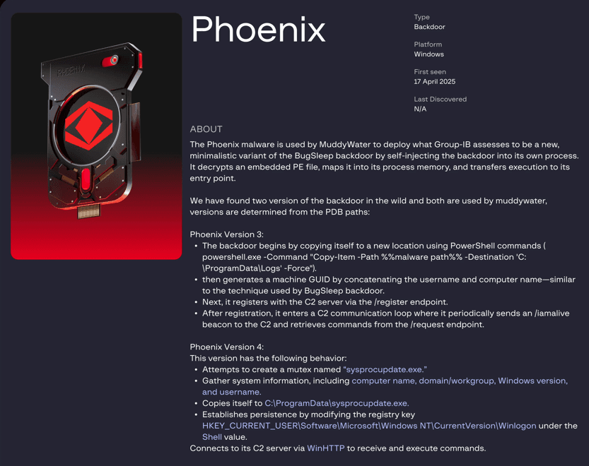 شرکت امنیت سایبری گروپ-آیبی (Group-IB) در گزارشی تحلیلی (لینک، بایگانی) در ۳۰ مهر ۱۴۰۴، از شناسایی یک کارزار جاسوسی سایبری گسترده توسط گروه هکری «مادیواتر» (MuddyWater) پرده برداشت. در این حملات از مجموعهای از بدافزارهای جدید و سفارشی، از جمله نسخه چهارم بدافزار «فینیکس» (Phoenix)، برای نفوذ به سیستمهای قربانیان در صنایع مختلف در سطح بینالمللی استفاده شده است. این یافتهها نشاندهنده تکامل مستمر تاکتیکها و ابزارهای این گروه است که گمان میرود تحت حمایت یک دولت فعالیت میکند.