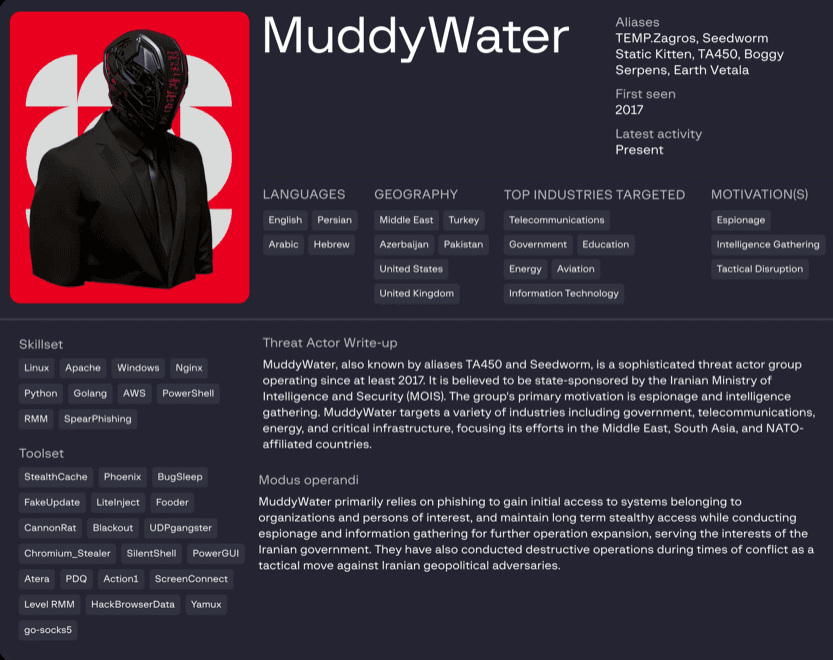 گروه مادیواتر که با نامهای دیگری همچون مرکوری (Mercury) و تمپ.زگروش (Temp.Zagros) نیز شناخته میشود، یک گروه تهدید مداوم پیشرفته (APT) است که حداقل از سال ۲۰۱۷ فعال بوده است. این گروه عمدتاً بر جاسوسی سایبری متمرکز است و نهادهای دولتی، سازمانهای مخابراتی، شرکتهای حوزه نفت و گاز و مؤسسات دانشگاهی را در خاورمیانه، اروپا، آسیا و آمریکای شمالی هدف قرار داده است.