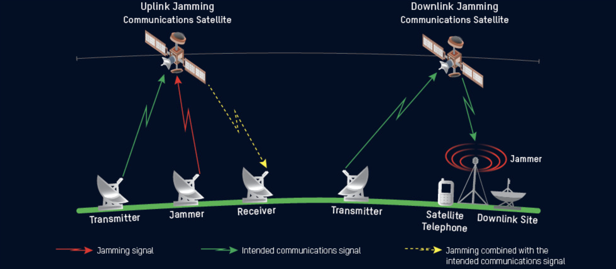 از نظر فنی، جمینگ به معنای تزریق سیگنالهای مزاحم و پرقدرت به یک باند فرکانسی مشخص است، طوری که سیگنال اصلی دیگر قابل دریافت، رمزگشایی یا استفاده نباشد. این اختلال میتواند به روشهای مختلف انجام شود؛ از ارسال نویز پهنباند برای کور کردن کامل یک بازه فرکانسی، تا جمینگ هدفمند که فقط یک سیگنال خاص مانند GPS، ارتباطات ماهوارهای یا لینک داده را مختل میکند.