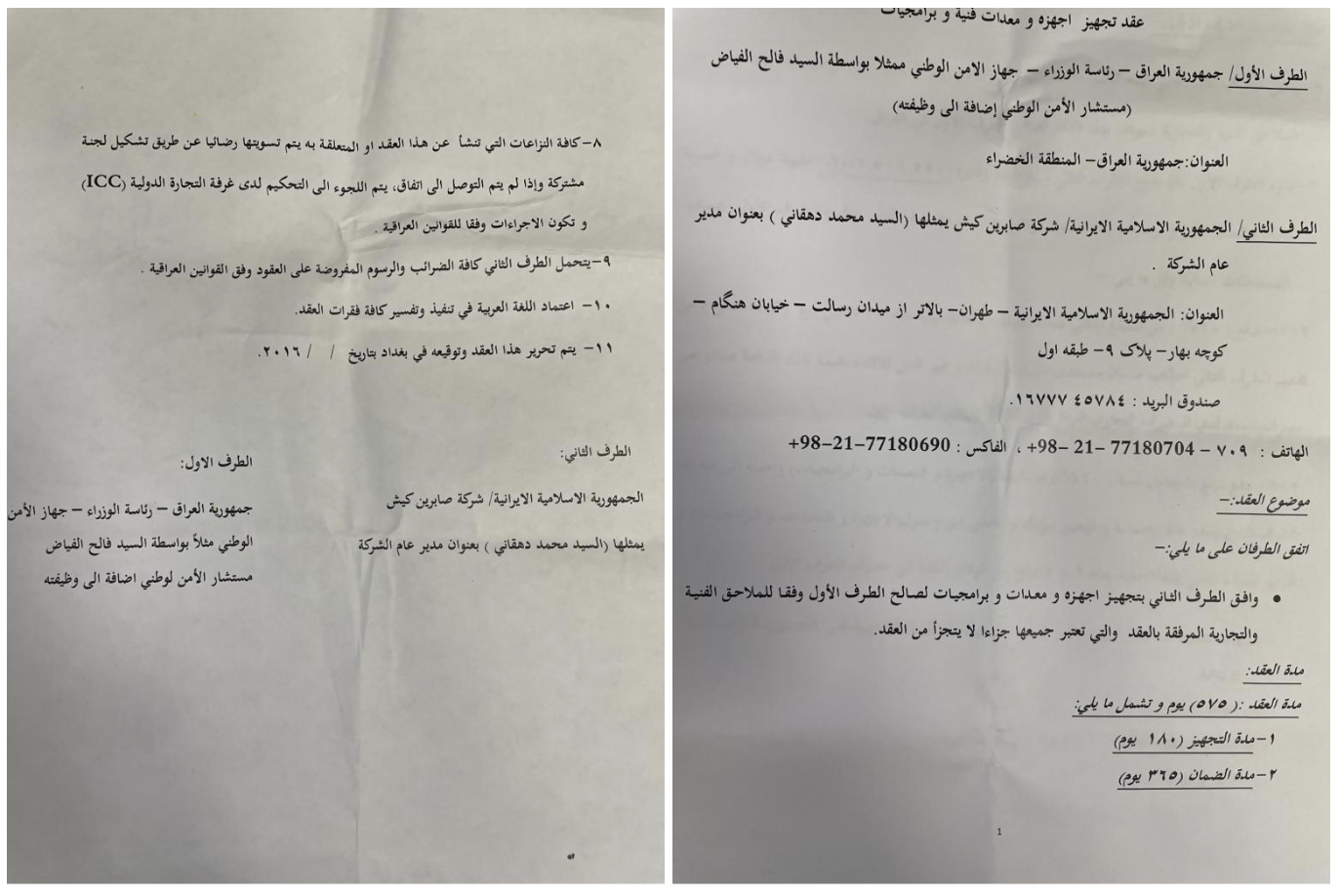 مهمترین بخش این پرونده، اسناد قراردادی مربوط به فروش مستقیم تجهیزات و خدمات به دولت عراق است. در یکی از اسناد، شرکت صابرین کیش بهعنوان طرف دوم قرارداد، متعهد به تامین تجهیزات فنی و نرمافزاری برای دستگاه امنیت ملی عراق معرفی شده است. محل اجرای قرارداد «منطقه سبز بغداد» ذکر شده و ساختار حقوقی آن شامل دوره تحویل، ضمانت و سازوکار حل اختلاف است؛ نشانهای روشن از یک قرارداد رسمی دولتی–دولتی، نه معامله غیررسمی. این قراردادها نشان میدهد که فناوریهایی که ابتدا برای کنترل داخلی در ایران توسعه یافتهاند، بهعنوان بستههای آماده سرکوب دیجیتال به عراق صادر شدهاند.