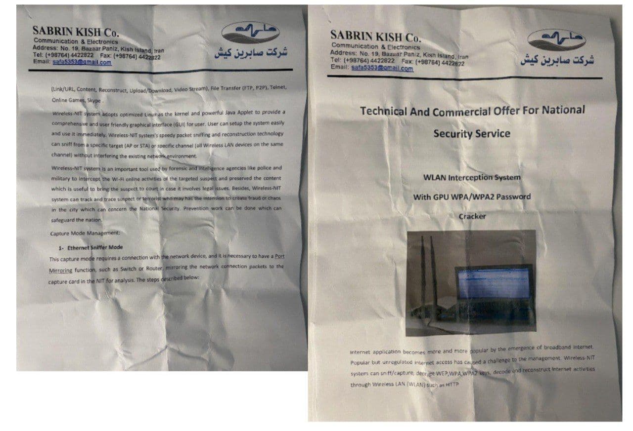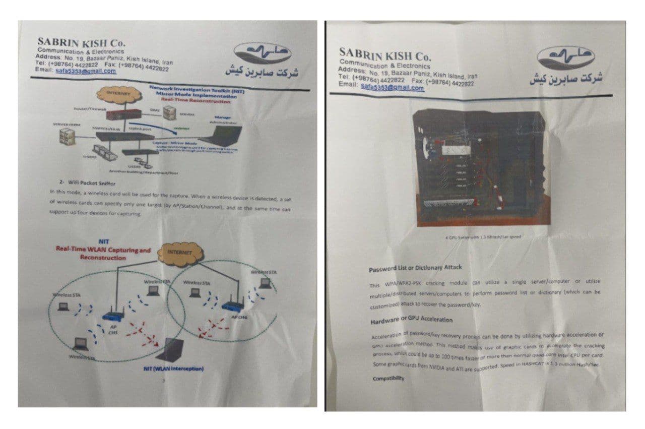 در کنار آن، اسناد مربوط به شنود WLAN و ابزارهای شکستن رمز WPA/WPA2 نشان میدهد که صابرین در حوزه نفوذ به شبکههای وایفای، بازسازی ترافیک داده و شنود ارتباطات اینترنتی محلی نیز فعال بوده است. این ابزارها دقیقا همان فناوریهایی هستند که برای کنترل تجمعات، شناسایی فعالان و رصد ارتباطات شهری به کار میروند.