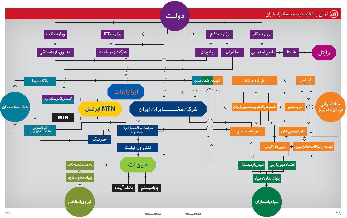 ایرانسل بهصورت رسمی یک شرکت مشترک است میان یک کنسرسیوم ایرانی و گروه مخابراتی آفریقای جنوبی به نام MTN. سهم MTN در ایرانسل ۴۹ درصد است، اما ۵۱ درصد دیگر در اختیار شرکت «گسترش الکترونیک ایران» است که توسط بنیاد مستضعفان انقلاب اسلامی و وزارت دفاع و پشتیبانی نیروهای مسلح اداره میشود. هر دوی این نهادها بهطور مستقیم تحت فرمان علی خامنهای، رهبر جمهوری اسلامی، فعالیت میکنند. بنیاد مستضعفان یکی از بزرگترین امپراتوریهای اقتصادی تحت کنترل بیت رهبری است و در اسناد بینالمللی بهعنوان نهاد پوششی سپاه پاسداران معرفی شدهاست.