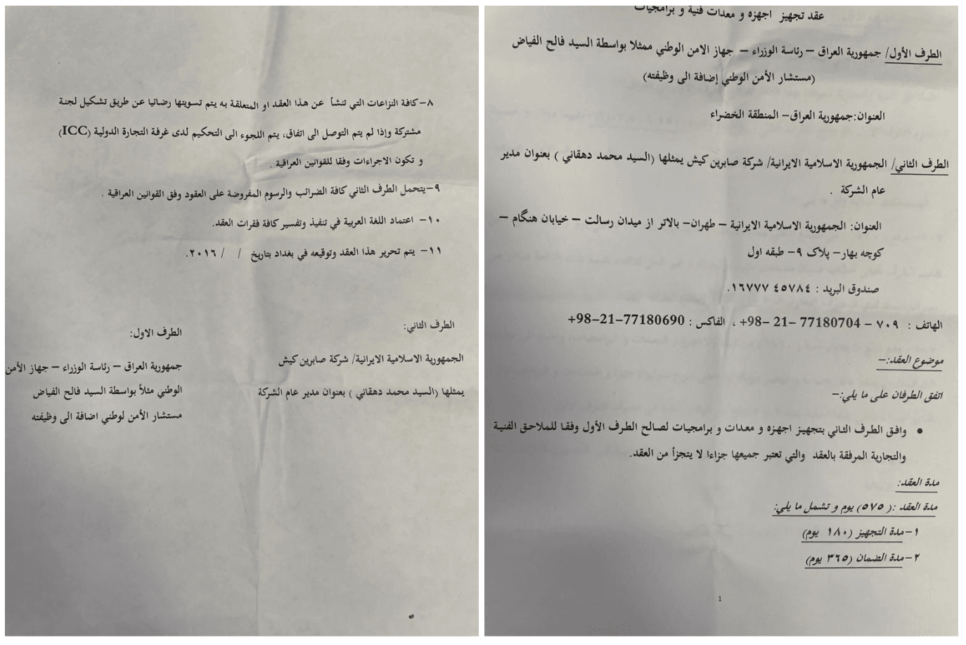 مهمترین بخش این پرونده، اسناد قراردادی مربوط به فروش مستقیم تجهیزات و خدمات به دولت عراق است. در یکی از اسناد، شرکت صابرین کیش بهعنوان طرف دوم قرارداد، متعهد به تامین تجهیزات فنی و نرمافزاری برای دستگاه امنیت ملی عراق معرفی شده است. محل اجرای قرارداد «منطقه سبز بغداد» ذکر شده و ساختار حقوقی آن شامل دوره تحویل، ضمانت و سازوکار حل اختلاف است؛ نشانهای روشن از یک قرارداد رسمی دولتی–دولتی، نه معامله غیررسمی. این قراردادها نشان میدهد که فناوریهایی که ابتدا برای کنترل داخلی در ایران توسعه یافتهاند، بهعنوان بستههای آماده سرکوب دیجیتال به عراق صادر شدهاند.